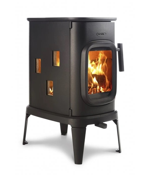 Kompaktní belgická litinová krbová kamna s velkým čelním sklem, bočním prosklením a vyobrazením norské legendy "The Three Billy-Goats Gruff".
