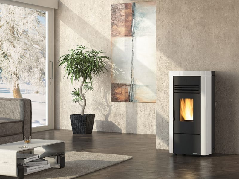 Teplovzdušná peletová kamna Extraflame Angelo Plus Evo ocelový lakovaný plášť a kachlová deska v bílé barvě s rozvodem teplého vzduchu mají jmenovitý výkon 8 kW, regulovatelný v rozmezí 2,5 - 8 kW. Vytápěcí schopnost je až 230 m3. Kapacita zásobníku na pelety je 15 kg. Spotřeba při jmenovitém 0,5 - 1,8 kg.